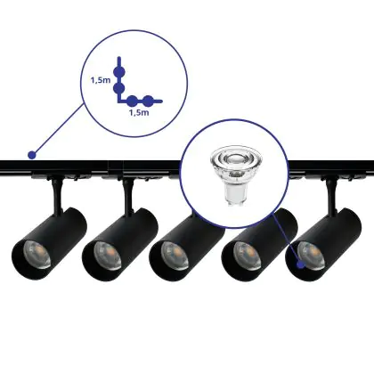 Complete Set 1-Phase Rail L 1,5 x 1,5 Meter Black | incl. 5x Spot + GU10 2700K 3W Dimmable + End Cap, Power Connector and L -Connector