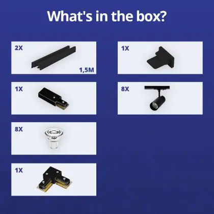 | Manufacturer Name | Complete L shaped 1-Phase Track Set Black incl. 8x Spot fixture + GU10 2700K 3W Dim – 1,5 x 1,5 mete | |
