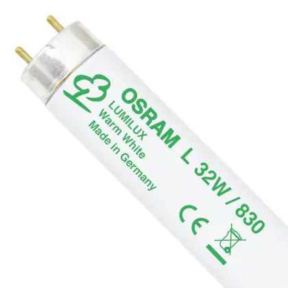 The Osram T8 L 32W/830 G13 ES Warm White are energy efficiency class ‘A’ fluorescent tubes characterized by a 32W power and endowed of a G13 socket. These tubes measure 120cm in length. Their life span is 20. 000 hours and their chromatic rendering is set between 80Ra and 89Ra. Their technical features assure an excellent stability of the luminous intensity at high levels of use and for the entire life span of the lamp. These tubes produce a warm white light, corresponding to a chromatic temperature of 3000K.